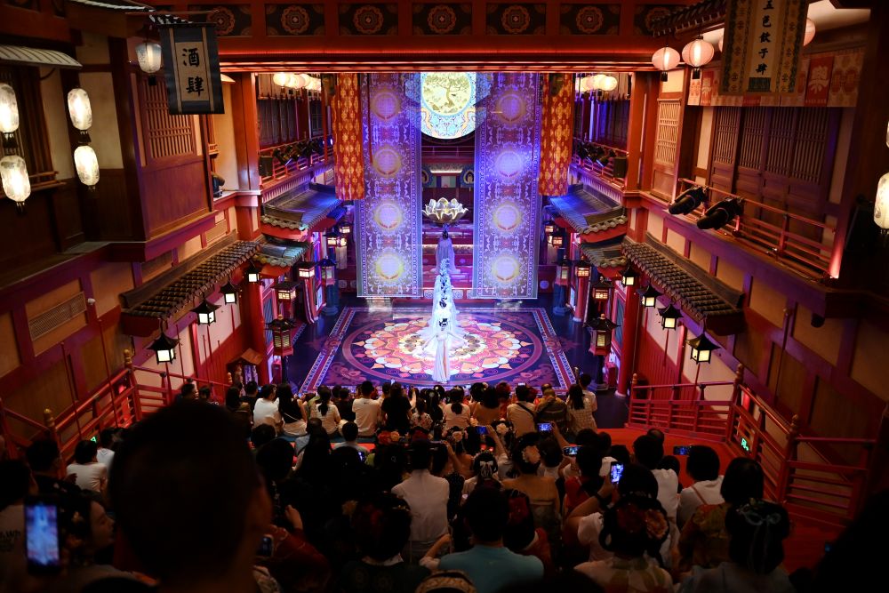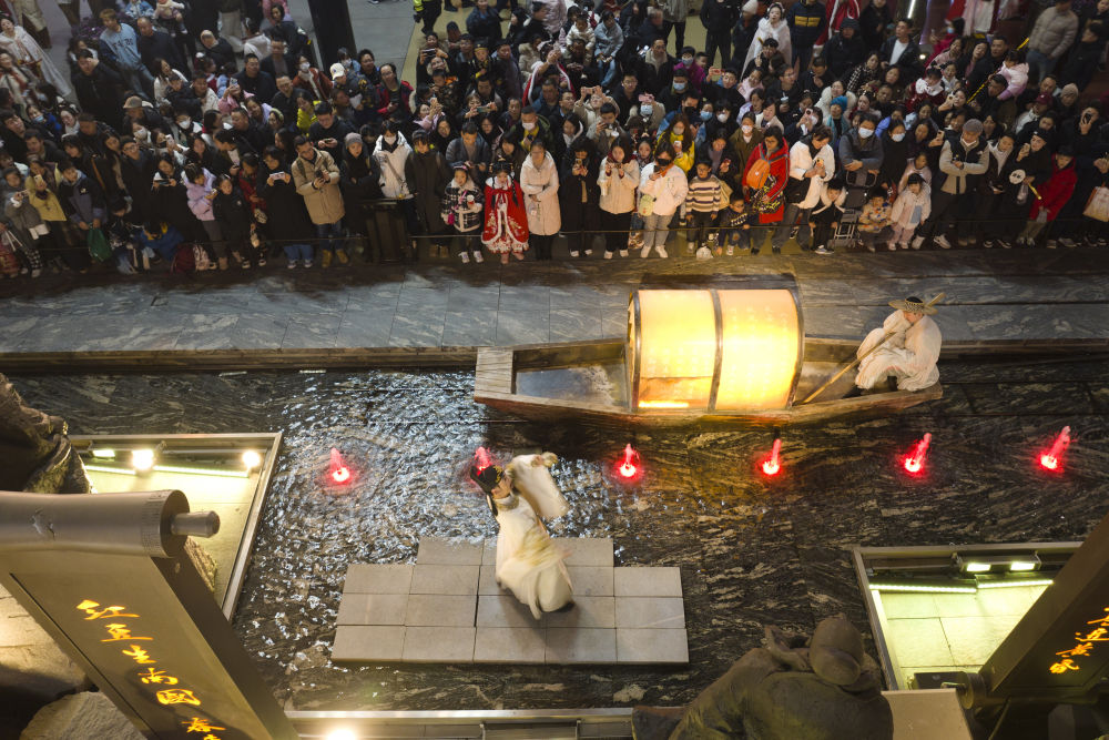 旅客正在西安年夜唐没有夜乡景区旁观以唐朝汗青文明为靠山创造的情形剧(无人机相片,2025年1月22日摄)。